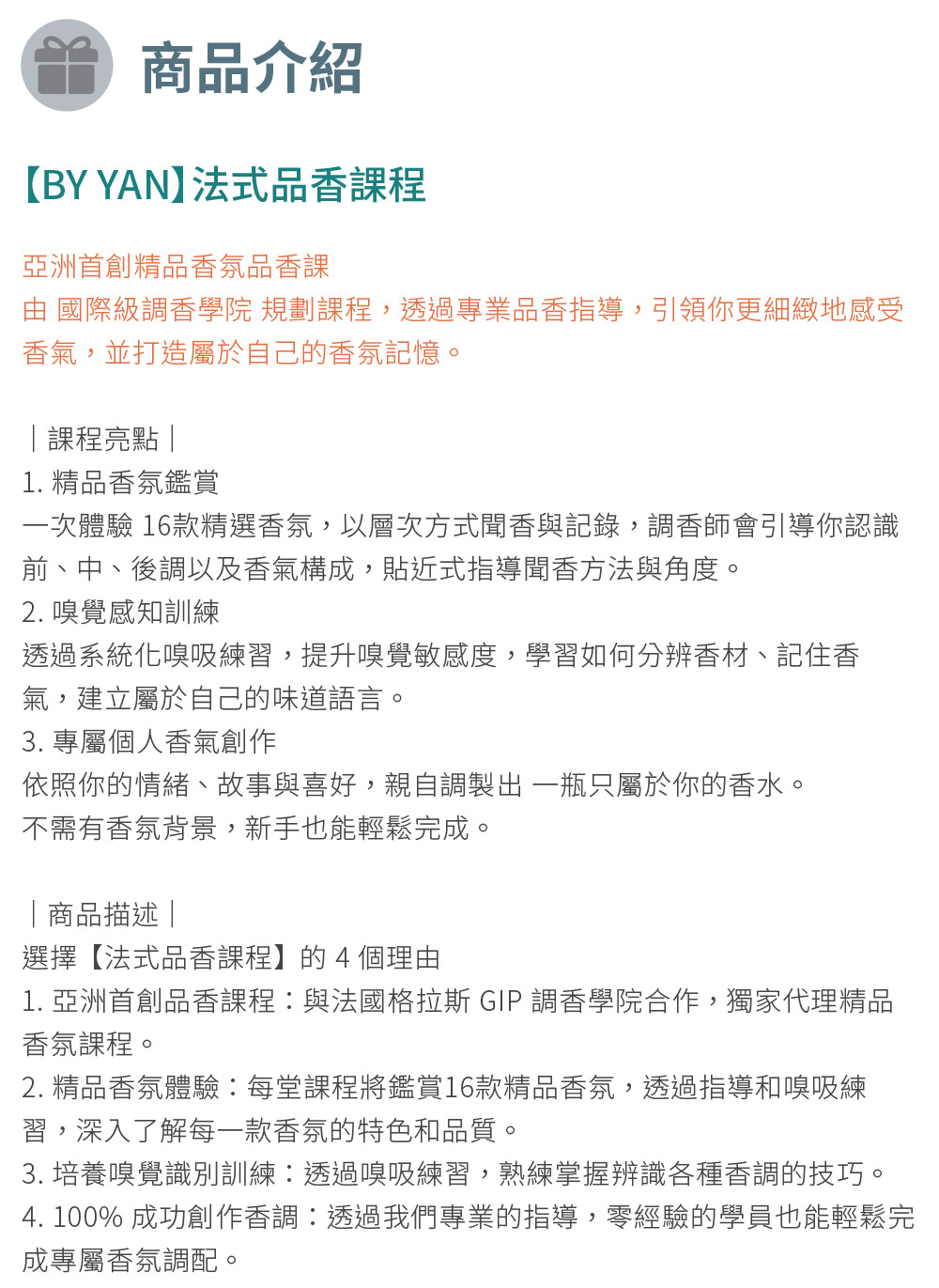 1. 本券平假日限單人使用兌換【BY YAN】法式品香課程券乙次。