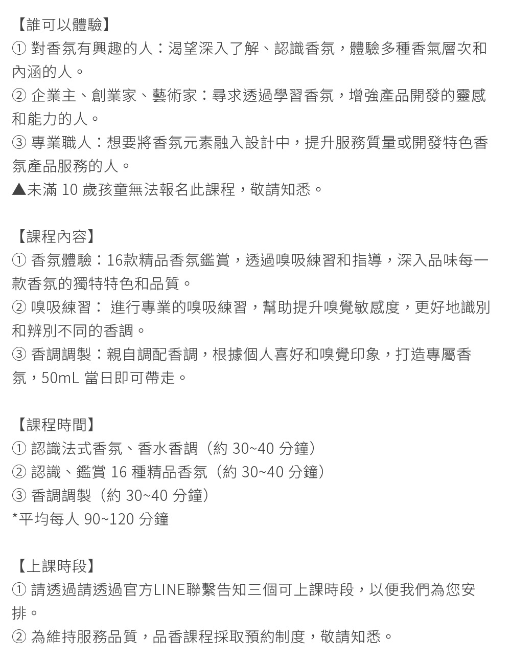 5. 課程期間禁止飲食、保持鞋履穿著,避免影響品香過程。