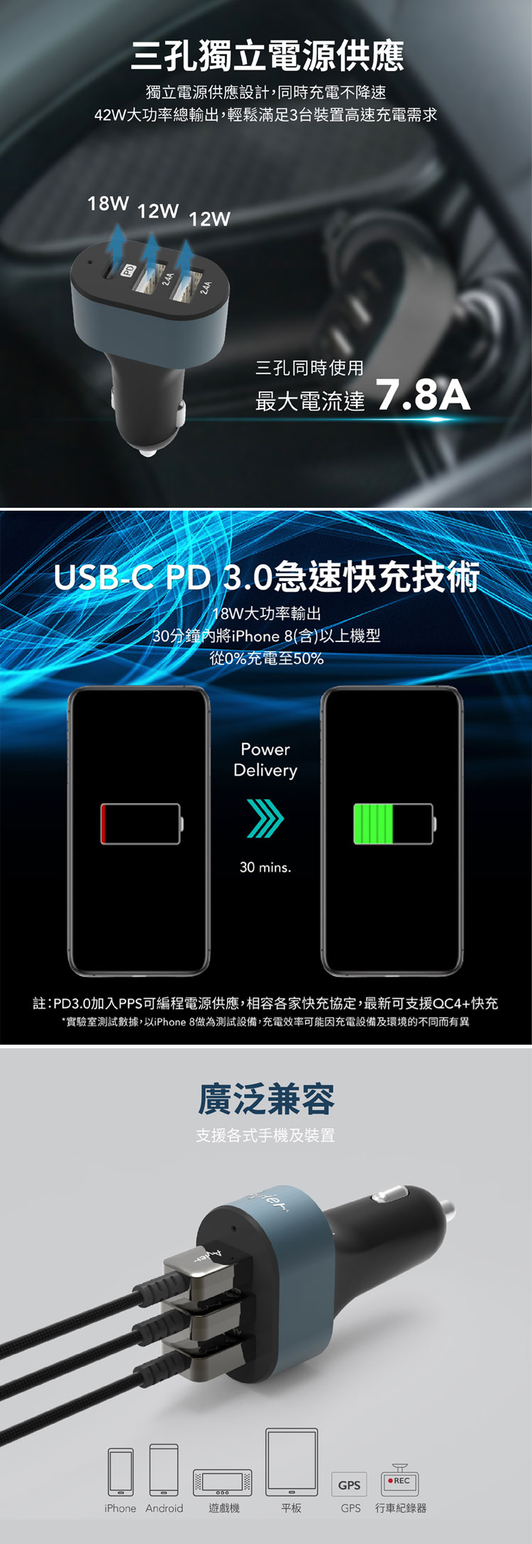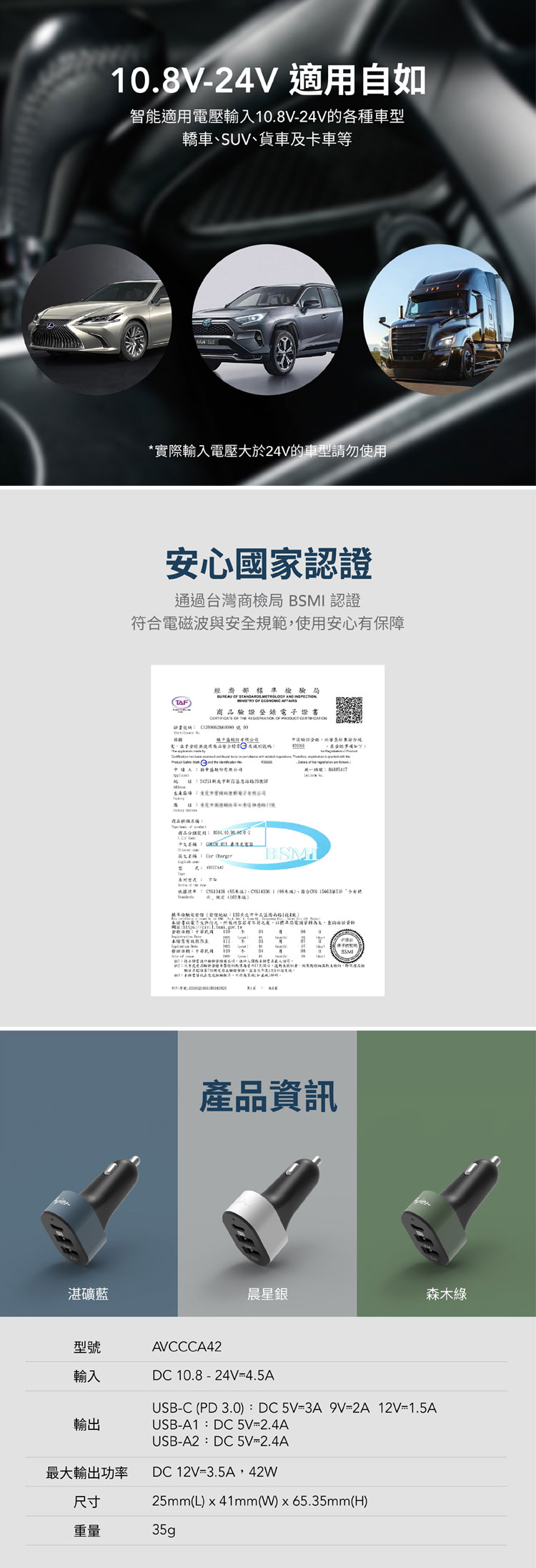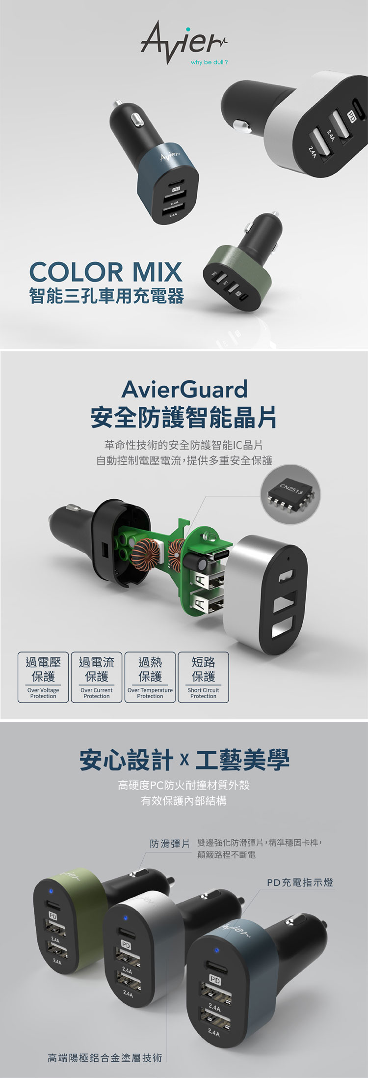 Avier|COLOR MIX 42W 智能三孔車用充電器-森木綠