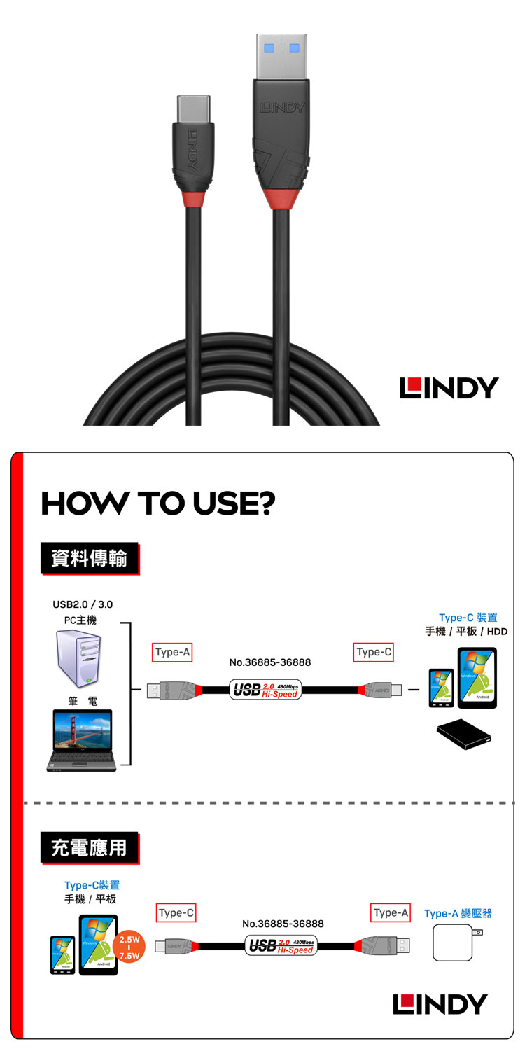 LINDY 林帝|USB 3.1 GEN 2 TYPE-C/公 TO TYPE-A/公 傳輸線(1.5M)