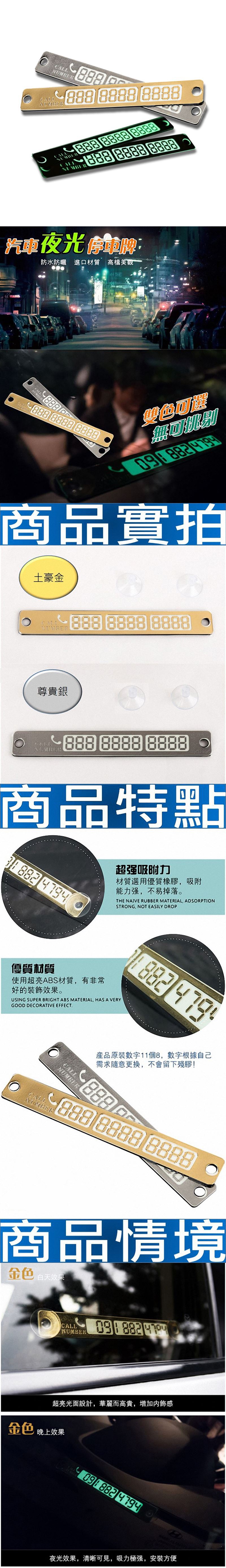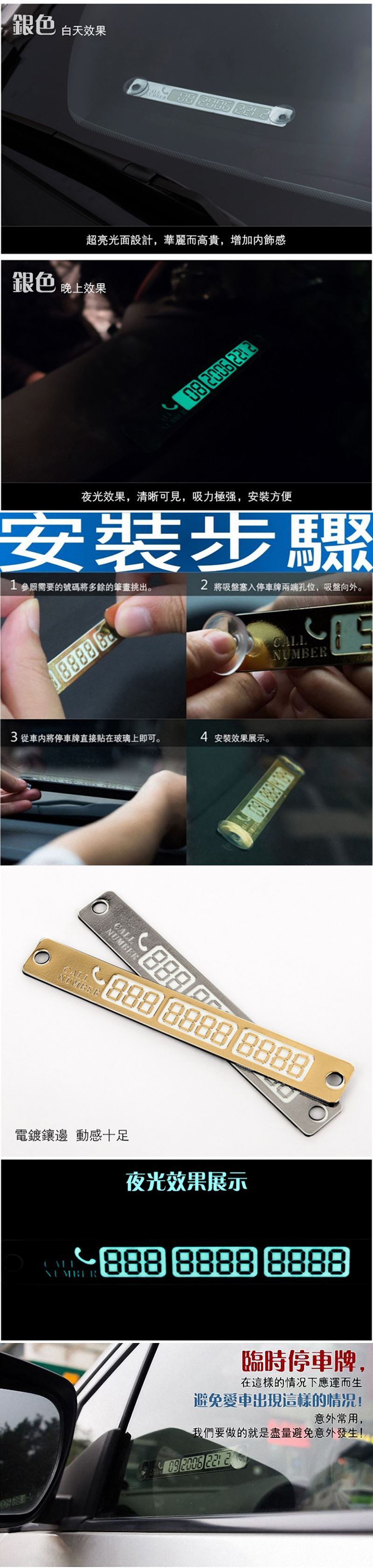 品名:汽車夜光臨時停車牌 顏色:金色/銀色 材質:ABS、PVC吸盤 尺寸:15*2cm 注意:實品無附贈刮片,可用指甲或硬幣刮除即可 ※商品圖檔顏色因電腦螢幕設定差異會略有不同,以實際商品顏色為準