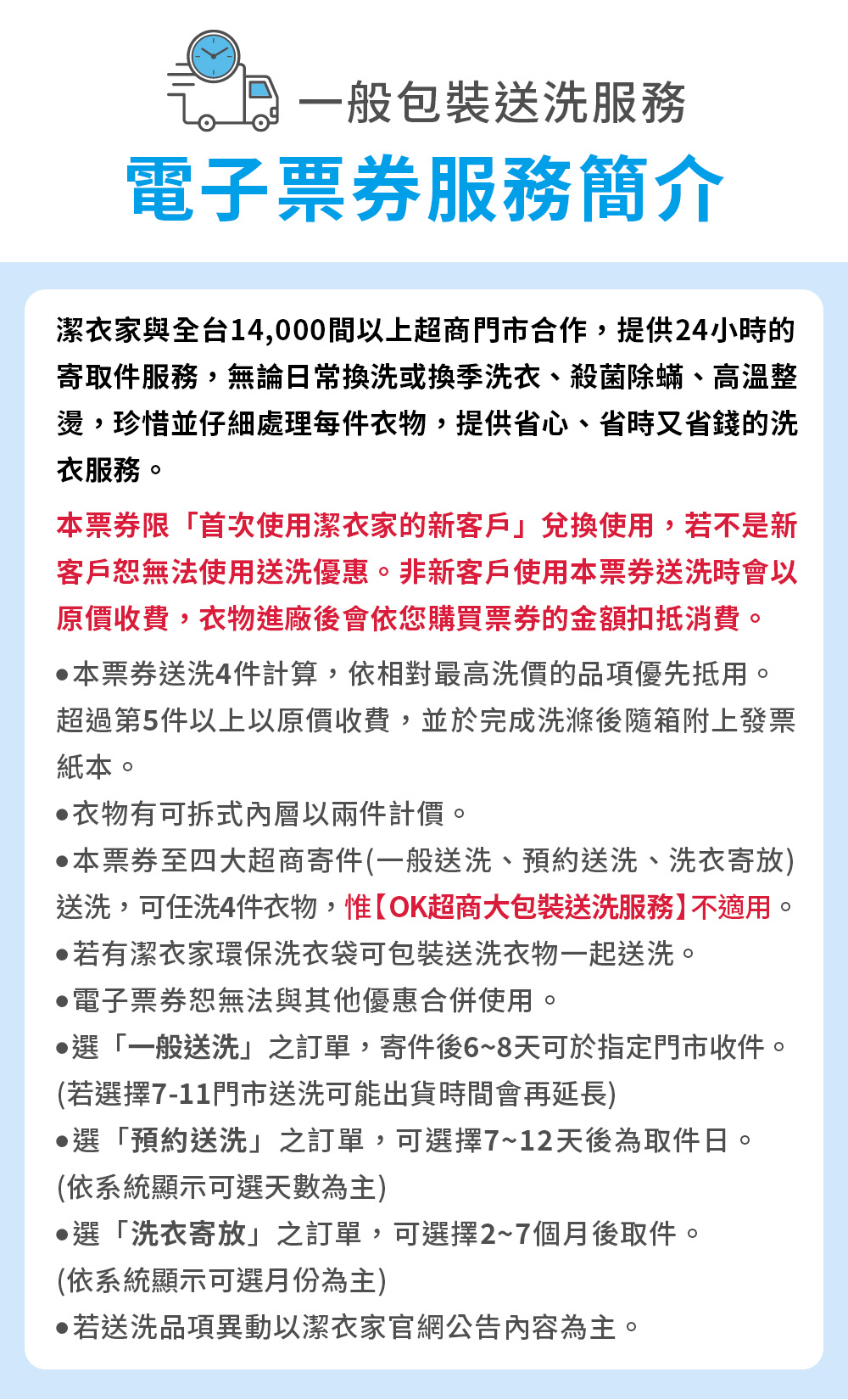 ●本票券不可使用「潔衣家OK超商大包裝送洗(送洗包裝尺寸:長+寬+高小於150cm)」。