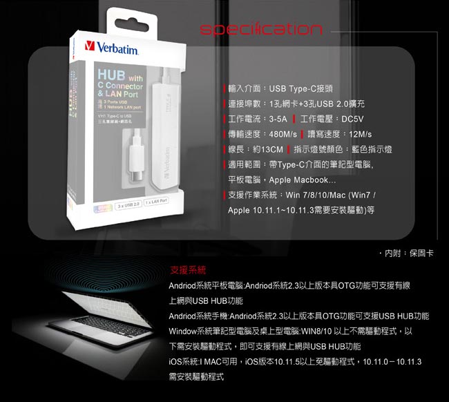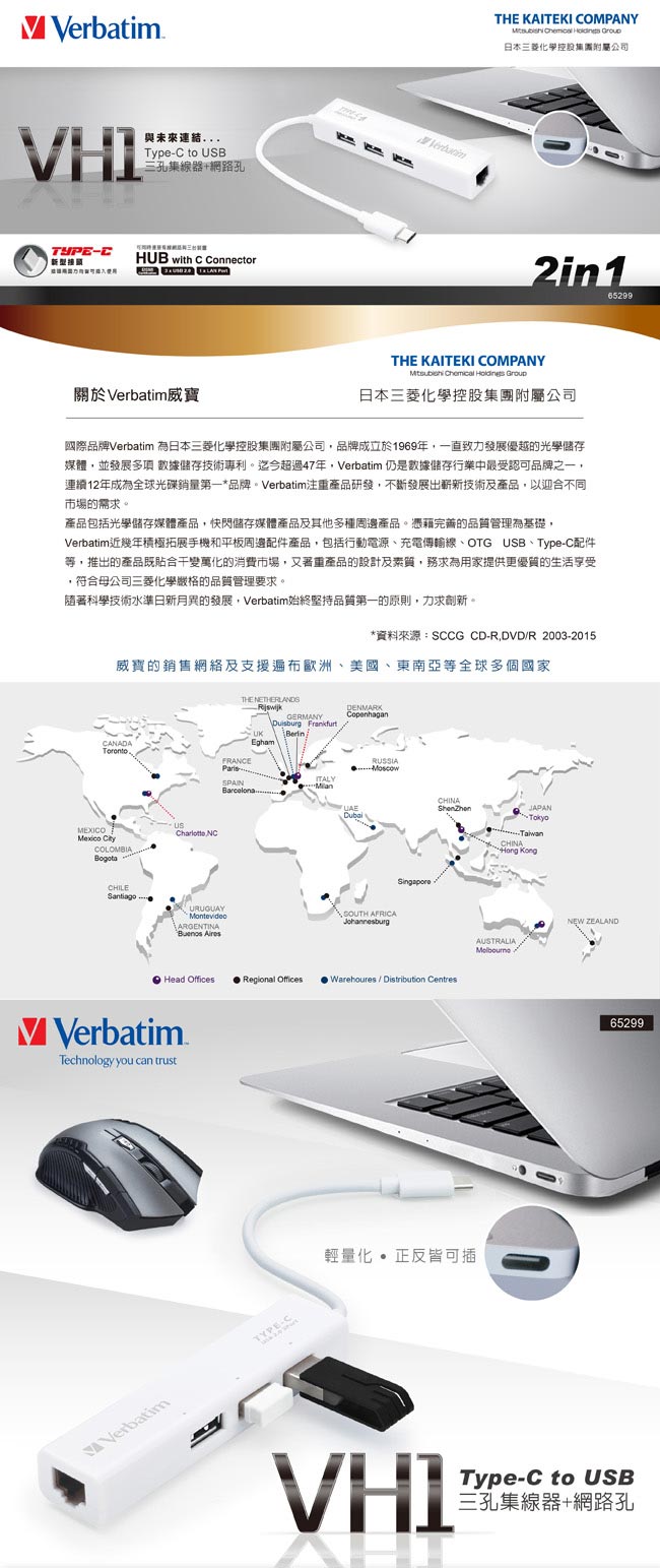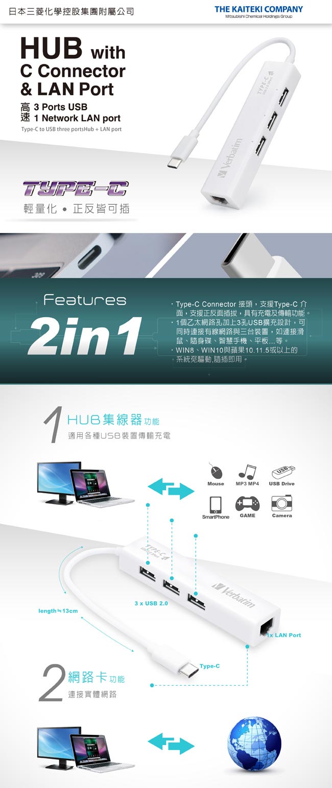 Verbatim|VH1 Type-C TO USB 三孔集線器+網路孔