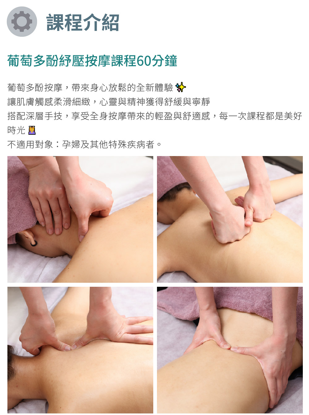 (1)單張使用:【葡萄多酚紓壓按摩課程60分鐘】:課前說明→沐浴更衣→全背釋壓→全身深度精油按摩→腿部紓壓按摩→頭部舒壓按摩