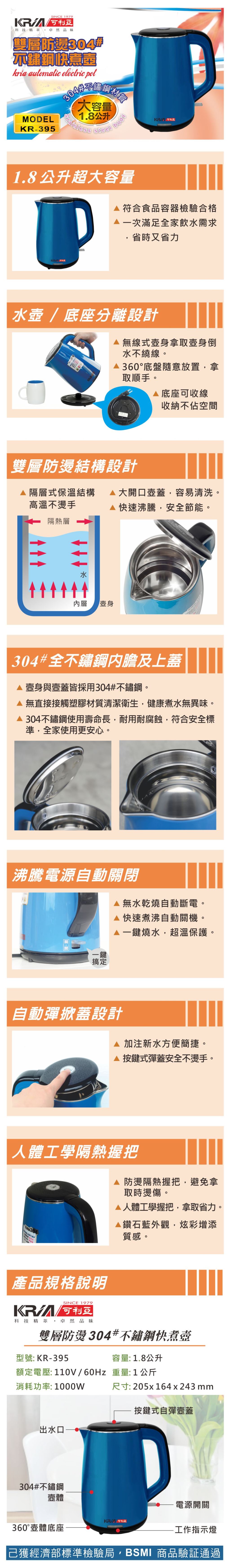 品 牌 :KRIA 可利亞 型 號:KR-395 商品尺寸(cm): 20.5 × 16.4 ×24.3 (cm) 商品重量(kg): 1KG 容 量:1.8公升 規 格:AC110V / 60Hz 消耗功率:1000W 產地:CHINA(台灣監製) 保固 : 全機保固一年