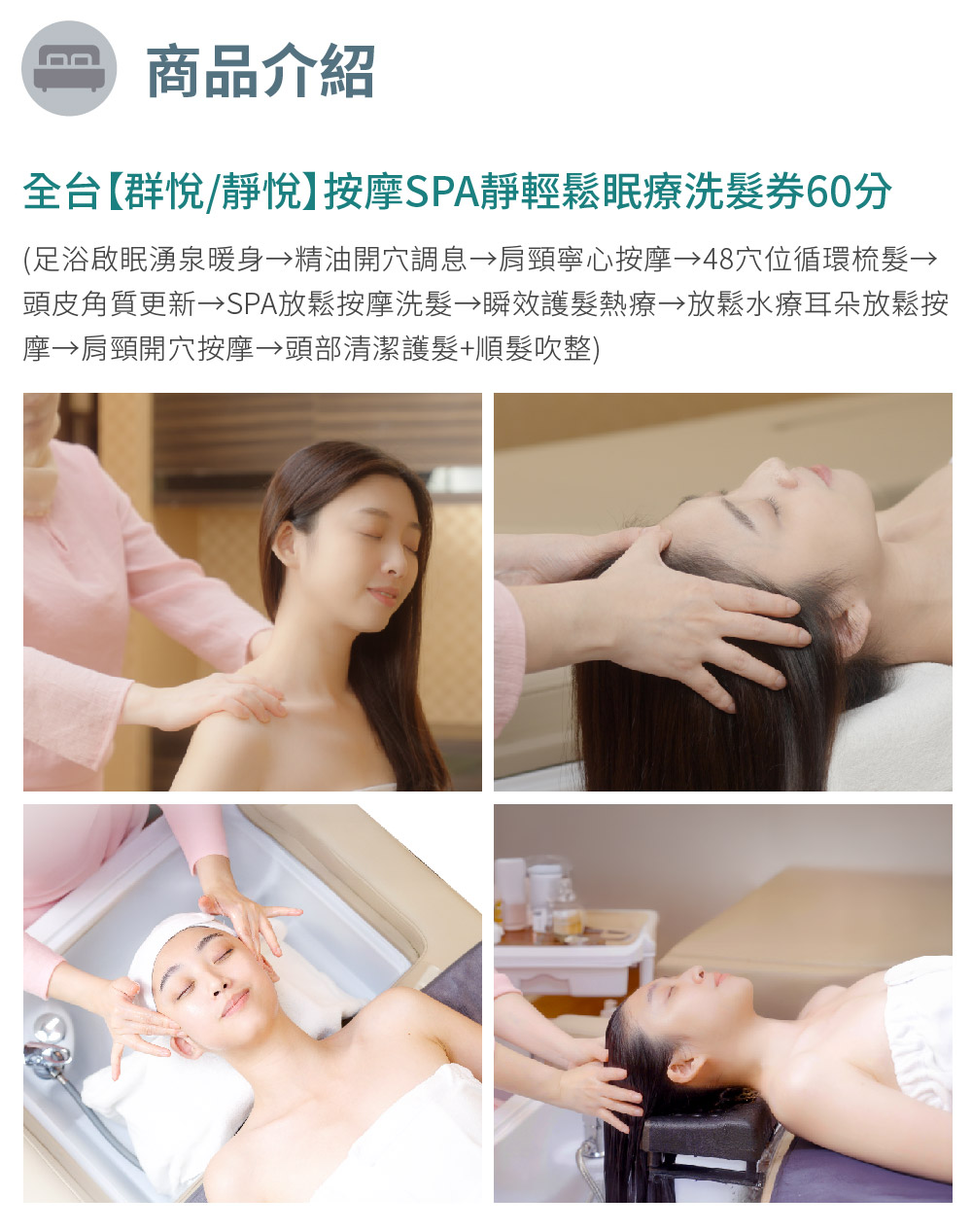 全台【群悅/靜悅】按摩SPA靜輕鬆眠療洗髮券60分(mo)