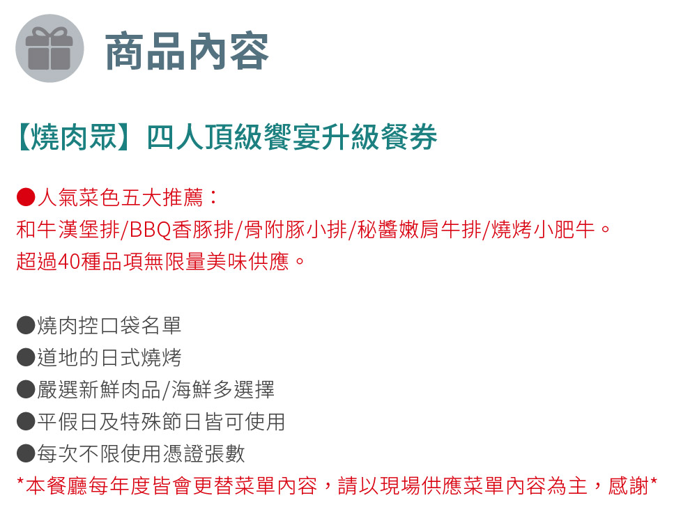 【使用注意事項】 ◎不得與其他優惠合併使用,恕無法兌換現金及找零 ◎請持手機電子票券到店使用 ◎兌換券逾期未使用,可辦理退費 以上規範如與兌換券不同,則依兌換券為準。