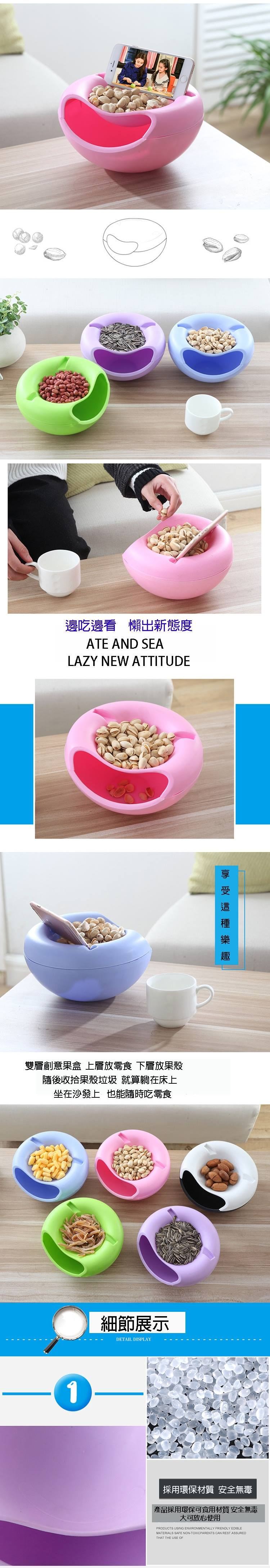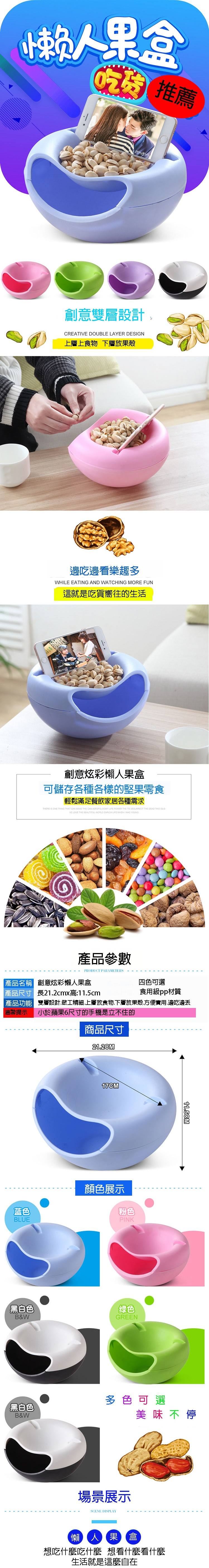 創意炫彩懶人果盒 非買不可理由 ★可儲存各式各樣的堅果零食 ★邊吃邊看樂趣多 ★創意雙層設計 ★隨後收拾果殼垃圾 雙層創意果盒.上層放零食.下層放果殼.隨後收拾果皮垃圾 就算躺在床上.坐在沙發上.也能隨時吃零食 想吃什麼吃什麼.想看什麼看什麼 生活就是這麼自在