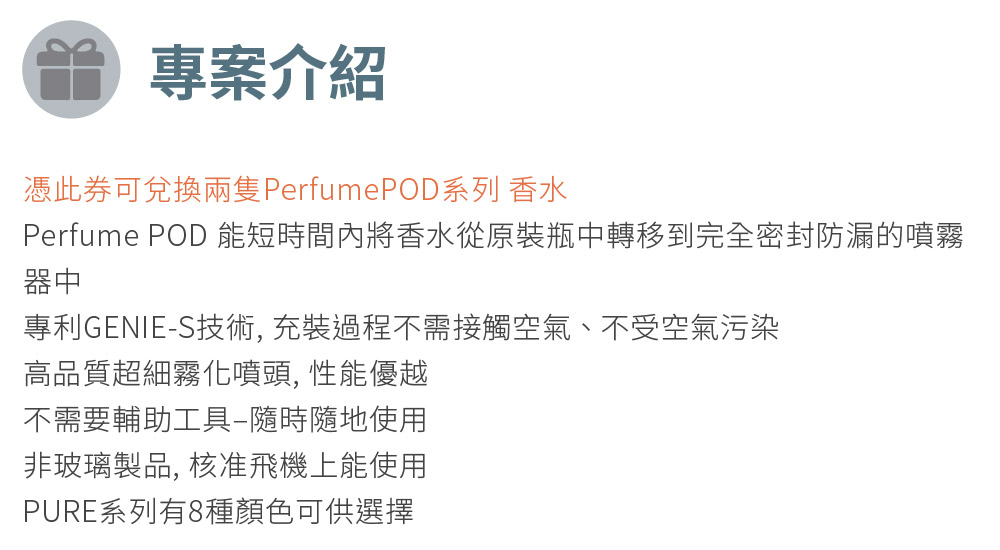 1.單張可兌換PerfumePOD 香水分裝瓶 Pure 系列1+1(限時優惠)兌換券(MO) 。