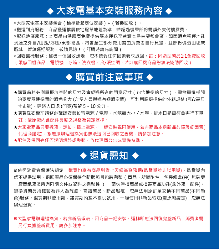 ★如果需要施工團隊特殊配送&安裝的大型家電(電視、冷氣、冰箱、洗衣機等)收到消費者付款之訂單需求後,將會派發給運送與施工團隊,當派單完成後,訂單狀態為出貨中,此狀態不一定是實際完成出貨,僅代表發單至施工團隊,實際以施工團隊與訂購者電話約裝的內容為主。 在3-5天工作天內,施工廠商將進行聯絡之約裝動作。