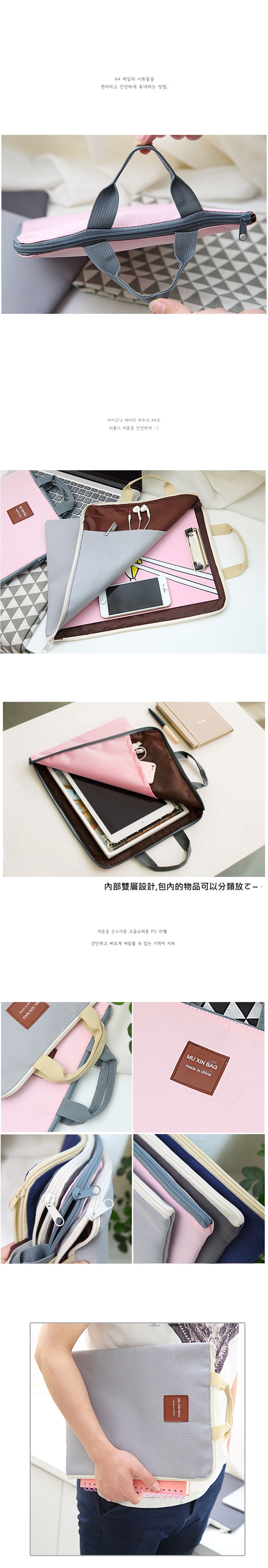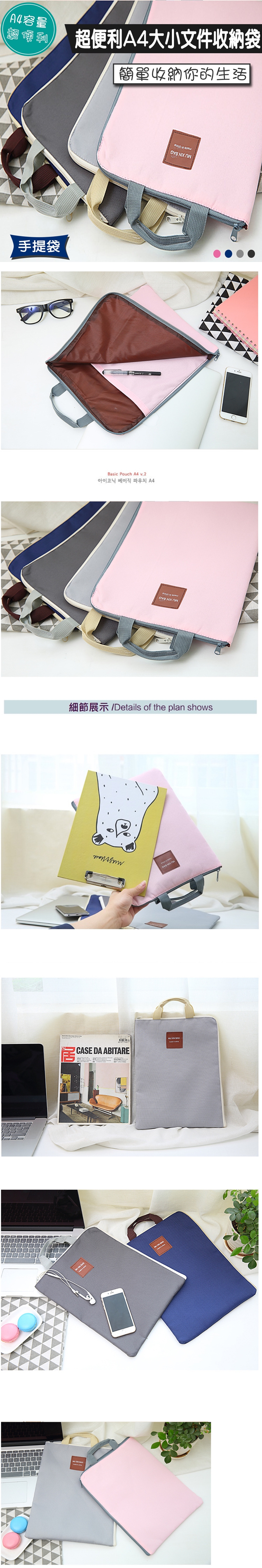萬用A4大小完美收納,可放置各式文件,內袋夾層更可放置辦公小物不凌亂,拉鍊設計確保內容物不掉出,提把設計輕鬆帶著走!