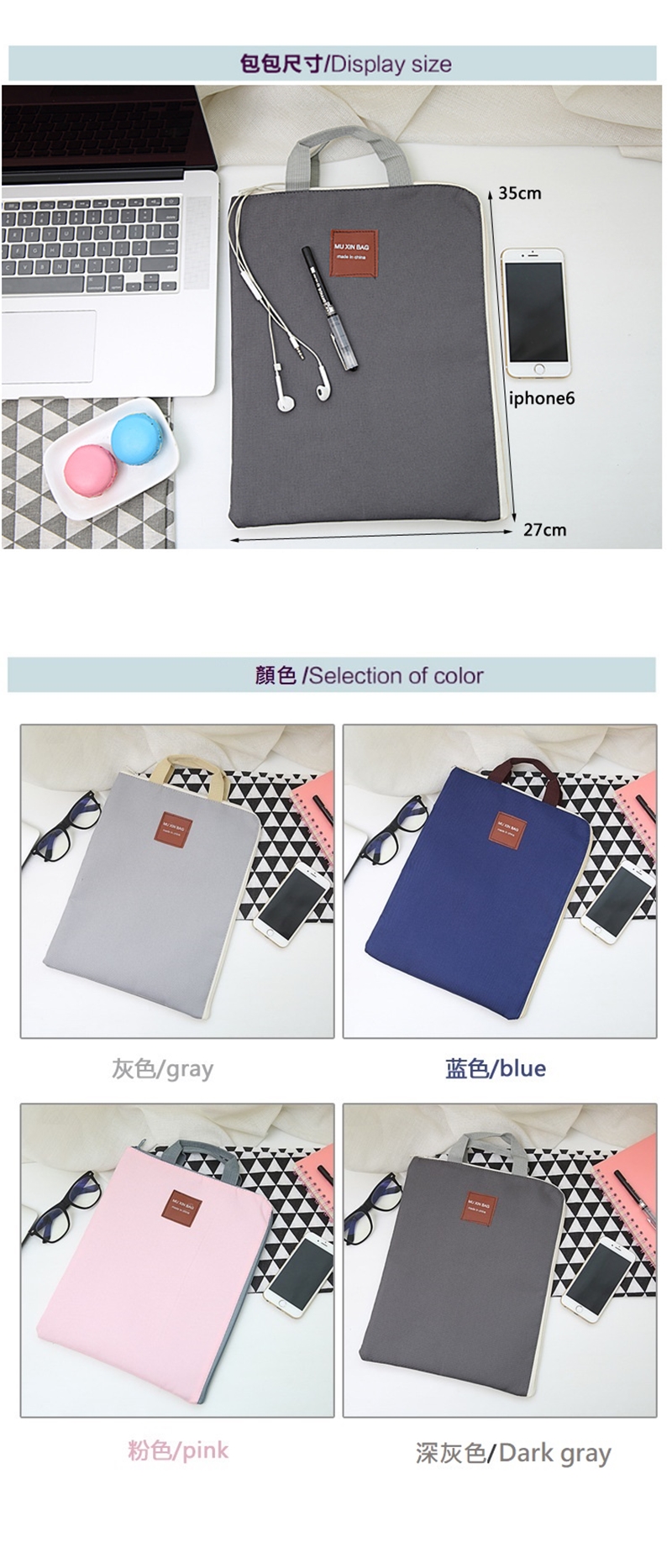 超便利A4文件拉鏈手提袋 顏色:粉色、淺灰色、深灰色、深藍色 尺寸:27x35cm 材質:牛津布 ※商品為平放測量,可能會因某些因素產生些許誤差,誤差值在1~3公分上下為合理範圍