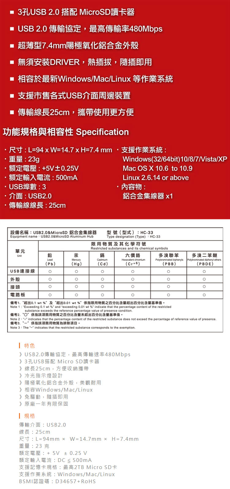 INTOPIC 廣鼎|USB2.0&MicroSD 鋁合金集線器(HC-33)
