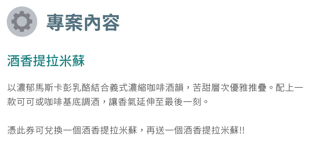 1.單張可兌換 (限時優惠)酒香提拉米蘇買一送一兌換券(MO)。