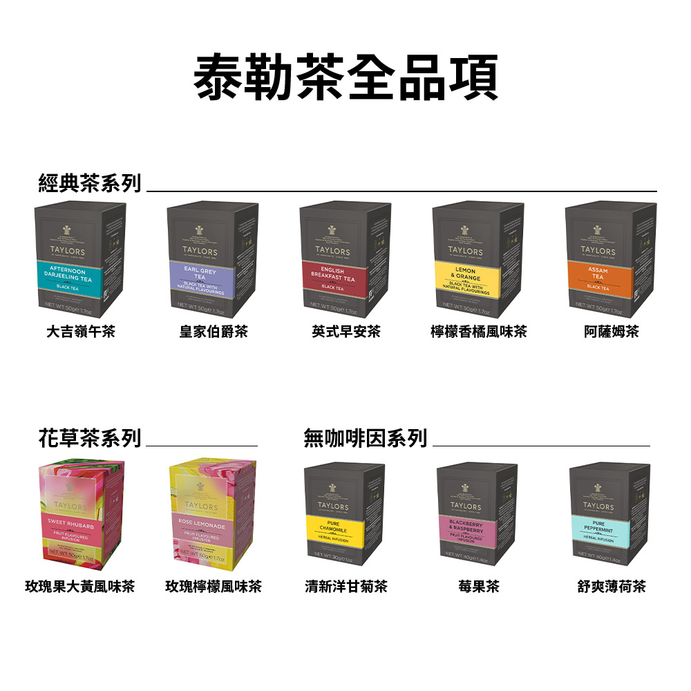 大吉嶺午茶、皇家伯爵茶、英式早安茶、檸檬香橘風味茶、阿薩姆茶