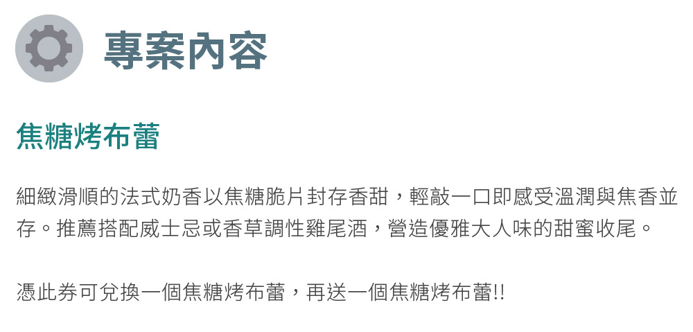 1.單張可兌換 (限時優惠)焦糖烤布蕾買一送一兌換券(MO)。