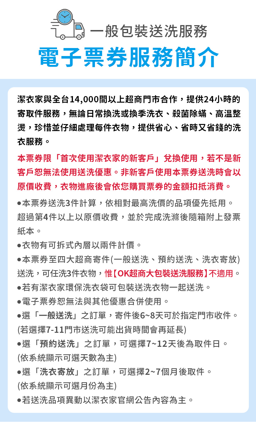 ●本票券不可使用「潔衣家OK超商大包裝送洗(送洗包裝尺寸:長+寬+高小於150cm)」。
