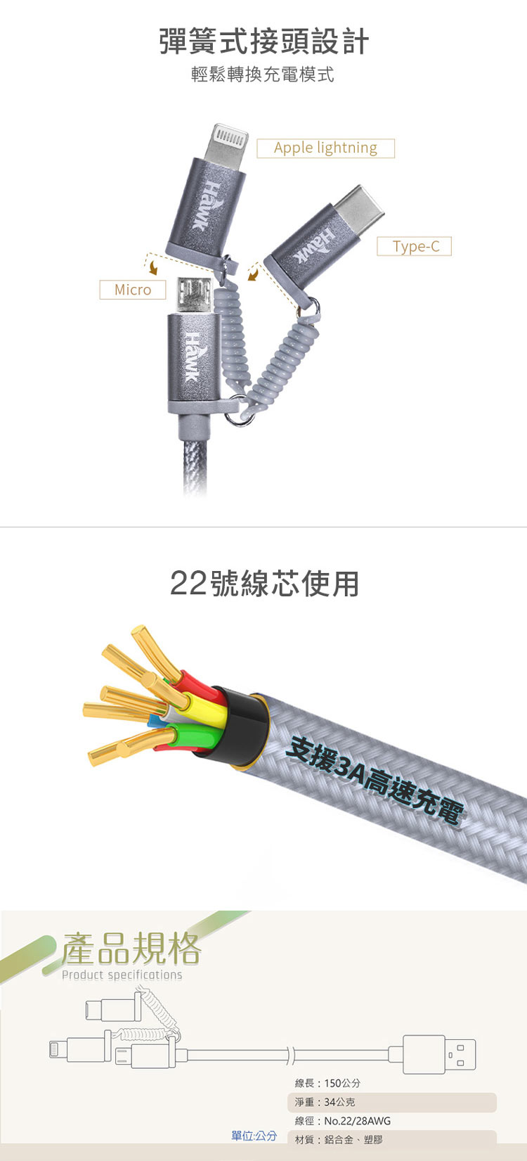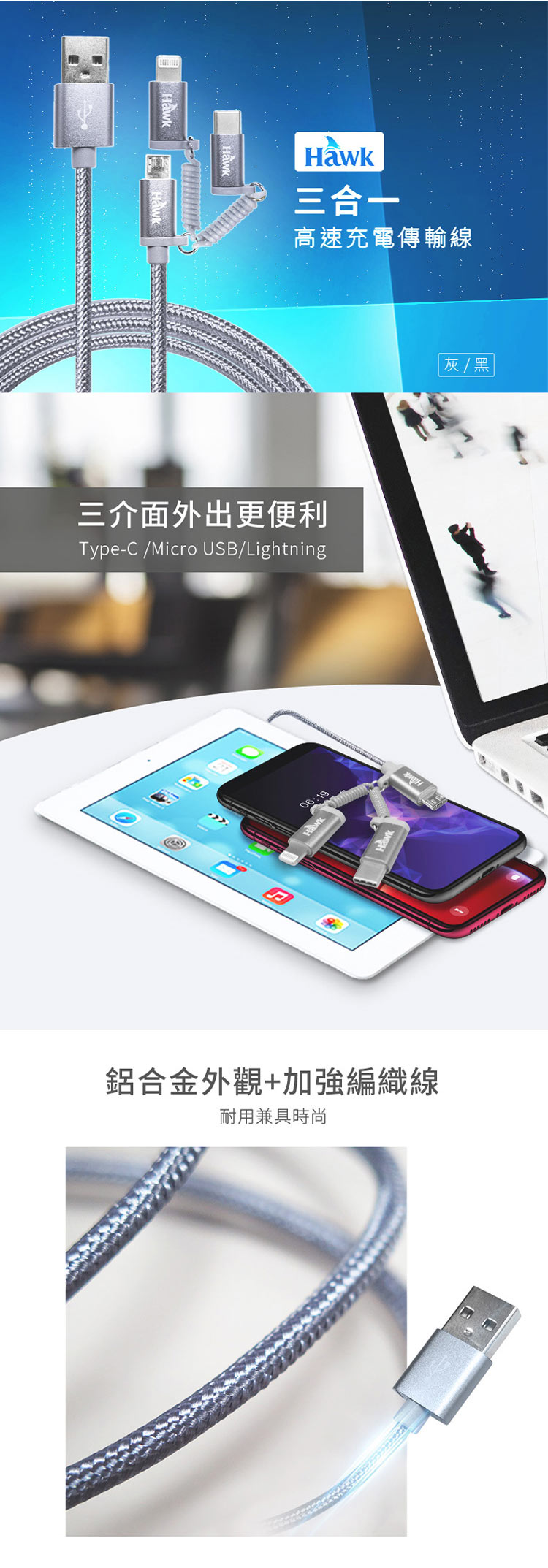 Hawk 浩客|三合一高速充電傳輸線(黑)