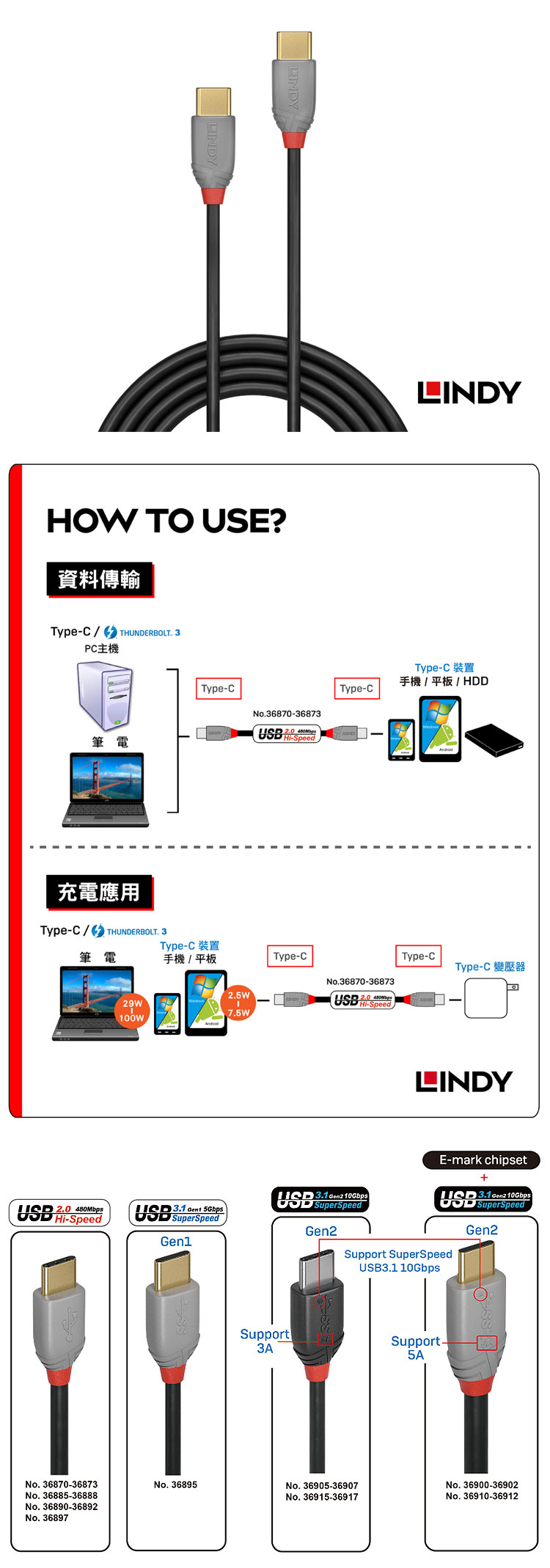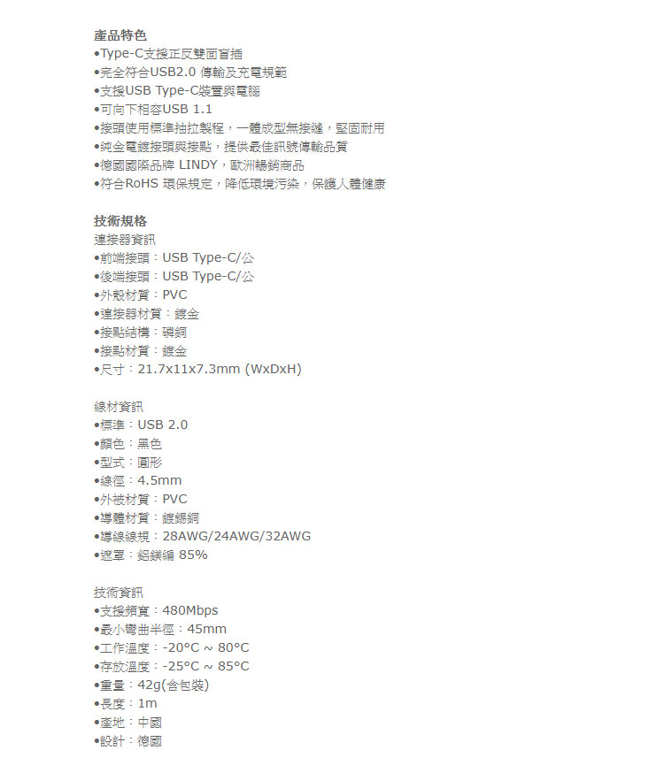 LINDY 林帝|USB 2.0 TYPE-C 公 TO 公 傳輸線(1M)