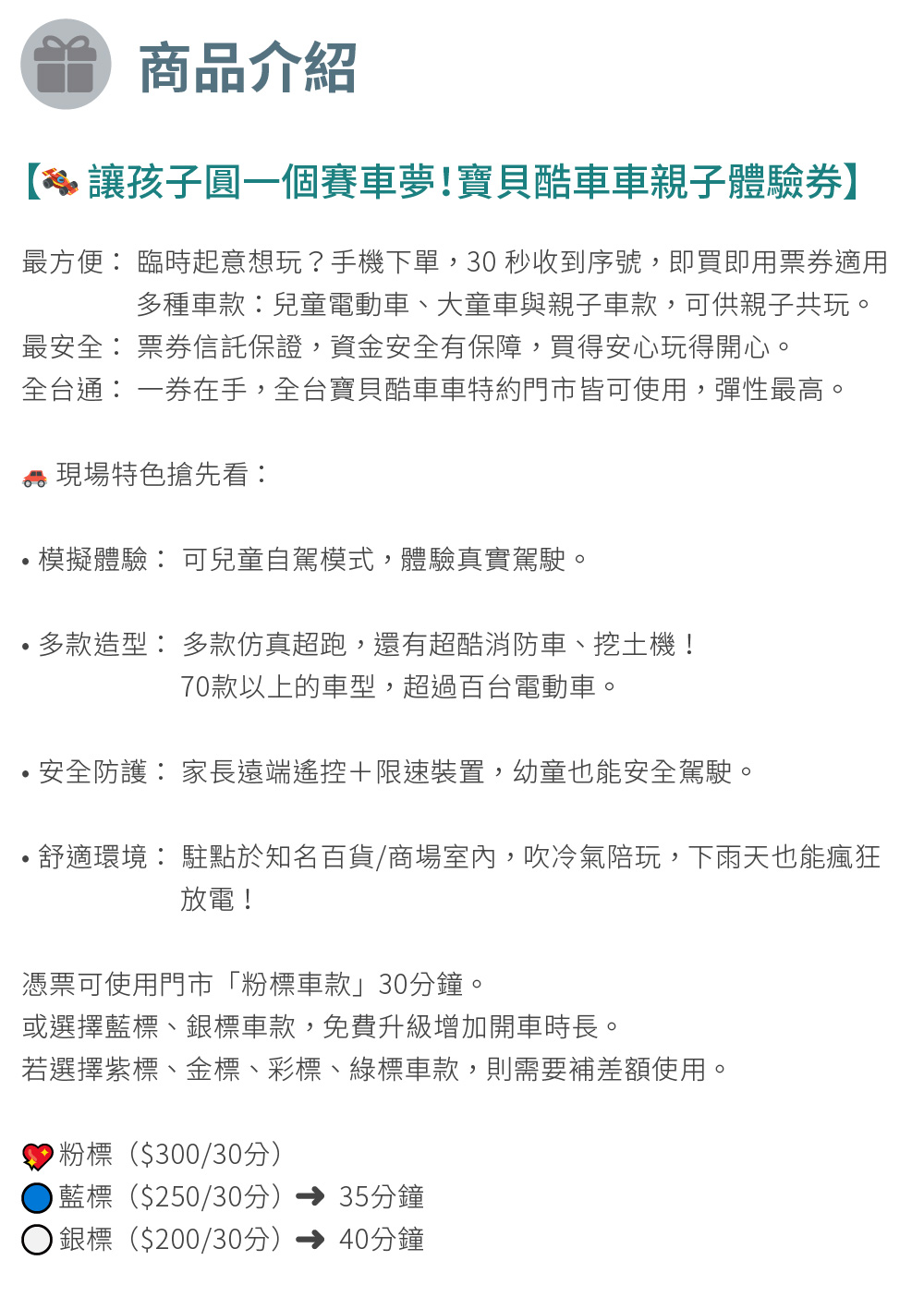 1.此票券可使用於寶貝酷車車全台門市&市集。