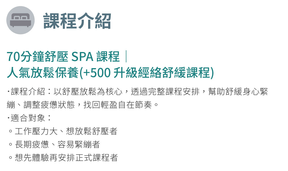2. 【票券限定】現場加價500元升級經絡舒緩課程(總課程時間增加為80分鐘)