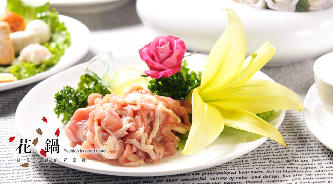 MENU 1 MENU 2 美味湯頭 關於花鍋 權益說明 MENU 1 花 天 錦 地 ─ 花茶 ─ 季節花茶 ─ 主餐選一 ─ 雪花牛肉 / 香草梅花豬 / 紐西蘭小肥羊 / 雞腿肉 Flank / Blade Shoulder / New Zealand Little Sheep / Chicken Leg 季節食蔬拼盤&餃類拼盤 Seasonal Vegetable Platter & Fish Paste and Dumpling Platter ─ 附餐選一 ─ 白飯 / 寬粉 / 讚歧烏龍麵 / 王子麵 Rice / Wide Glass Noodles / Udon Noodles/ Instant Noodles ─ 甜點選一 ─ 野莓繽紛樂冰淇淋 / 巧花甜心布蕾 / 義式提拉米蘇 Strawberry Ice Cream / Flowering Pudding / Italy Tiramisu ─ 飲料選一 ─ 咖啡 / 紅茶 / 柚香果茶 Coffee / Black Tea / Pomelo Juice ─ 無限暢飲 ─ 冰沙 / 花果醋 花 團 錦 簇 ─ 花茶 ─ 季節花茶 ─ 主餐選一 ─ 雪花牛肉 / 香草梅花豬 / 紐西蘭小肥羊 / 雞腿肉 Flank / Blade Shoulder / New Zealand Little Sheep / Chicken Leg ─ 海鮮拼盤 ─ 白蝦、鯛魚片、鮮蚵、日月貝、一口小花枝 White Shrimp、Tilapia、Oyster、Scallops、Small squid 季節食蔬拼盤&餃類拼盤 Seasonal Vegetable Platter & Fish Paste and Dumpling Platter ─ 附餐選一 ─ 白飯 / 寬粉 / 讚歧烏龍麵 / 王子麵 Rice / Wide Glass Noodles / Udon Noodles/ Instant Noodles ─ 甜點選一 ─ 野莓繽紛樂冰淇淋 / 巧花甜心布蕾 / 義式提拉米蘇 Strawberry Ice Cream / Flowering Pudding / Italy Tiramisu ─ 飲料選一 ─ 咖啡 / 紅茶 / 柚香果茶 Coffee / Black Tea / Pomelo Juice ─ 無限暢飲 ─ 冰沙 / 花果醋 品生活優惠憑證使用條款 此憑證由等值購物金兌換之 本憑證不得與其他優惠合併使用,且恕無法兌換現金 好康憑證不限本人使用,使用時店家將會核對憑證編號,一組編號限用一次 信託期間:發售日起一年內 本商品(服務)禮券所收取之金額,已存入發行人於台新銀行開立之信託專戶,專款專用。所稱專用,係指供發行人履行交付商品或提供服務義務使用查看好康憑證使用條款 MENU 2 風 花 雪 月 ─ 花茶 ─ 季節花茶 ─ 沙拉 ─ 主廚鮮蝦沙拉 Shrimp Salad ─ 主餐選一 ─ 沙朗牛肉 / 松阪玫瑰豬 / 紐西蘭小羊肩 / 雞腿肉 Sirloin / Pork Joul / New Zealadn Lamb Shoulder / Chicken Leg ─ 海鮮拼盤 ─ 明蝦、龍膽石斑、鮭魚片、帶殼生蠔、日月貝、一口小花枝 Prawn、Giant grouper、Salmon、Oyester、Scallops、Small squid 季節食蔬拼盤&餃類拼盤 Seasonal Vegetable Platter & Fish Paste and Dumpling Platter ─ 附餐選一 ─ 白飯 / 寬粉 / 讚歧烏龍麵 / 王子麵 Rice / Wide Glass Noodles / Udon Noodles/ Instant Noodles ─ 甜點選一 ─ 野莓繽紛樂冰淇淋 / 巧花甜心布蕾 / 義式提拉米蘇 Strawberry Ice Cream / Flowering Pudding / Italy Tiramisu ─ 飲料選一 ─ 咖啡 / 紅茶 / 柚香果茶 Coffee / Black Tea / Pomelo Juice ─ 無限暢飲 ─ 冰沙 / 花果醋 名 花 有 主 ─ 花茶 ─ 季節花茶 ─ 沙拉 ─ 和風海藻鮑魚沙拉 Abalone Salad ─ 主餐選一 ─ 無骨牛小排 / 松阪玫瑰豬 / 紐西蘭小羊肩 / 雞腿肉 Boneless Short Rib / Pork Joul / New Zealadn Lamb Shoulder / Chicken Leg ─ 龍蝦鱈場蟹拼盤 ─ 龍膽石斑、鮭魚片、帶殼生蠔、北海道干貝、龍蝦、活鮑魚、鱈場蟹 Giant grouper、Salmon、Oyester、Scallop、Lobster、Abalone、King Crab 季節食蔬拼盤&餃類拼盤 Seasonal Vegetable Platter & Fish Paste and Dumpling Platter ─ 附餐選一 ─ 白飯 / 寬粉 / 讚歧烏龍麵 / 王子麵 Rice / Wide Glass Noodles / Udon Noodles/ Instant Noodles ─ 甜點選一 ─ 野莓繽紛樂冰淇淋 / 巧花甜心布蕾 / 義式提拉米蘇 Strawberry Ice Cream / Flowering Pudding / Italy Tiramisu ─ 飲料選一 ─ 咖啡 / 紅茶 / 柚香果茶 Coffee / Black Tea / Pomelo Juice ─ 無限暢飲 ─ 冰沙 / 花果醋 風花雪月及名花有主皆加贈 情人節主廚限定甜點:心心相印莓果慕斯 情人節主廚限定特調飲品:藍色愛情海 / 粉紅色天堂一杯 品生活優惠憑證使用條款 此憑證由等值購物金兌換之 本憑證不得與其他優惠合併使用,且恕無法兌換現金 好康憑證不限本人使用,使用時店家將會核對憑證編號,一組編號限用一次 信託期間:發售日起一年內 本商品(服務)禮券所收取之金額,已存入發行人於台新銀行開立之信託專戶,專款專用。所稱專用,係指供發行人履行交付商品或提供服務義務使用查看好康憑證使用條款 美味湯頭 櫻花昆布鍋 Kelp Broth with Cherry Petals 取自北海道的昆布與日本櫻花 襯托出柴魚的鮮味 玫瑰麻辣鍋 Spicy Hot Pot with Rose Petals 選用多種中藥配方及鮮花椒所熬製的湯底 加入高湯,融合重慶及台灣的麻辣火鍋 精心調製新風味 蟲草花鍋 Pork Broth with Cordyceps and Flowers 含有豐富的蛋白質跟胺基酸 搭配豬大骨熬製而成的濃郁湯頭 品生活優惠憑證使用條款 此憑證由等值購物金兌換之 本憑證不得與其他優惠合併使用,且恕無法兌換現金 好康憑證不限本人使用,使用時店家將會核對憑證編號,一組編號限用一次 信託期間:發售日起一年內 本商品(服務)禮券所收取之金額,已存入發行人於台新銀行開立之信託專戶,專款專用。所稱專用,係指供發行人履行交付商品或提供服務義務使用查看好康憑證使用條款 關於花鍋 遠離塵囂的秘密花園 ─ 「城市花園.花卉火鍋創意料理」 一個隨時可讓旅人遠離城市繁忙步調的休閒空間,結合花藝、美食、藝術的祕密花園,強調慢活、無負擔的身心靈舒緩遊憩環境,提供全新體驗的創意美食與用餐空間。 建築體以「花卉」設計為主軸,完美融合現代感的時尚、以及自然採光的景觀、加入裝置藝術品, 創造全方位之美食饗宴,成為台北市全新休憩觀光景點。 品生活優惠憑證使