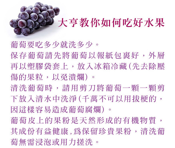 商品特色 食用方法 水果大亨 權益說明 商品特色 巨峰葡萄(英語:Vitis vinifera)是釀酒葡萄的一個變種,最早在日本培育,包含在亞洲所生產的葡萄之中形狀最大的種類Kyoho,故在日本又叫作「葡萄之王」。 巨峰葡萄大約在四十年前從日本移民到台灣,在這塊土地生根結果,經台灣果農不斷研發,一年可分夏、冬兩季收成,不但成為台灣鮮食葡萄的第一名,還外銷日本市場。 台灣本產的巨峰葡萄在成長期,都有進行果帽或套袋作業,讓每串葡萄都被細心的保護著,採收時,也會使用透氣保鮮袋來包裝葡萄,讓葡萄保持新鮮送達到饕客手上。 巨峰葡萄果粒碩大,整串葡萄大小均勻整齊,白色果粉濃郁勻稱,吃的時候不需要剝皮,只要放進嘴裡推一下,就可以輕鬆吃到飽滿香甜、多汁美味的果肉,真是讓人無法忘懷的超幸福滋味! 來自大亨的保證 每一種水果都有等級之分,從產地到外型都是挑選依據累積20多年的選果經驗,已經不是達人的境界可以形容,加上本身挑嘴的堅持,不好吃的寧可不賣。 這是水果大亨能夠屹立20年不變的信賴,老客戶們也是這麼被寵壞。一樣的堅持在每一個水果品項的挑選,所以,你會吃到的每一個水果,都是精選。 產地:台灣 商品規格:3串/盒 注意事項:新鮮水果,請盡速食用完畢 品生活優惠憑證使用條款 此憑證由等值購物金兌換之 本憑證不得與其他優惠合併使用,且恕無法兌換現金 好康憑證不限本人使用,使用時店家將會核對憑證編號,一組編號限用一次 信託期間:發售日起一年內 本商品(服務)禮券所收取之金額,已存入發行人於台新銀行開立之信託專戶,專款專用。所稱專用,係指供發行人履行交付商品或提供服務義務使用查看好康憑證使用條款 食用方法 品生活優惠憑證使用條款 此憑證由等值購物金兌換之 本憑證不得與其他優惠合併使用,且恕無法兌換現金 好康憑證不限本人使用,使用時店家將會核對憑證編號,一組編號限用一次 信託期間:發售日起一年內 本商品(服務)禮券所收取之金額,已存入發行人於台新銀行開立之信託專戶,專款專用。所稱專用,係指供發行人履行交付商品或提供服務義務使用查看好康憑證使用條款 水果大亨 「吃好水果,人生大事!」是我們深信的理念。 而我們實踐它的方式,是透過每日嚴選來自世界各地的新鮮優質果物,用最細心的呵護,把這些天然且當令的新鮮果物,完美圓潤的送到每一個人的面前,享受自然大地極致的視覺與味覺饗宴。 「吃好水果,人生大事!」是我們深信的價值。 節日喜慶,關鍵時刻,為尊敬、心愛、重要的人獻上一份大亨嚴選的精緻水果禮盒,那一份珍貴的心意與人情,伴隨著濃郁果香和鮮甜,將逐漸發酵醞釀成為人生不可磨滅的關係與記憶。 ─ 美好價值,大亨嚴選 ─ 品生活優惠憑證使用條款 此憑證由等值購物金兌換之 本憑證不得與其他優惠合併使用,且恕無法兌換現金 好康憑證不限本人使用,使用時店家將會核對憑證編號,一組編號限用一次 信託期間:發售日起一年內 本商品(服務)禮券所收取之金額,已存入發行人於台新銀行開立之信託專戶,專款專用。所稱專用,係指供發行人履行交付商品或提供服務義務使用查看好康憑證使用條款 權益說明 配送事項 ●配送時間:商品最晚於購買成功5個工作日內出貨完畢,出貨後配送約2~3個工作日,恕無法指定 送達時間 ●配送方式:冷藏宅配 鑑賞期 ●宅配商品可享七天鑑賞期,看更多詳細說明 品生活優惠憑證使用條款 此憑證由等值購物金兌換之 本憑證不得與其他優惠合併使用,且恕無法兌換現金 好康憑證不限本人使用,使用時店家將會核對憑證編號,一組編號限用一次 信託期間:發售日起一年內 本商品(服務)禮券所收取之金額,已存入發行人於台新銀行開立之信託專戶,專款專用。所稱專用,係指供發行人履行交付商品或提供服務義務使用查看好康憑證使用條款