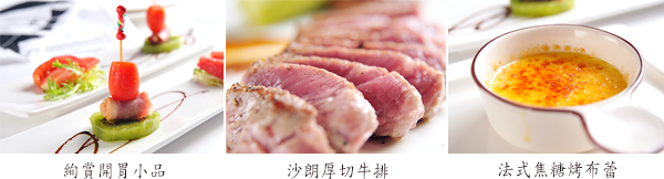 絢賞開胃小品 一份 1606手感麵包 一份 絢賞美味湯品 四選一 地中海鮮味巧達濃湯、黑松露原野蘑菇湯 台南府城鮮牛湯、巴黎風尚南瓜湯 絢彩琉璃沙拉 四選一 凱撒皇家俱樂部、水果の優 緋達起司時蔬總匯、奧斯陸醃燻鮭魚沙拉 芙蓉杯蛋 一份 果香雪泥 一份 米食.麵食 二選一 季節香噴噴炒飯、帕斯托義大利麵 特選季節海鮮 一份 主菜 任選一 法式藍帶雞腿排、野莓三星鴨胸、田園醬燒松阪豬 1940黛安菲力牛排、沙朗薄燒五重奏、沙朗厚切牛排、蘋果BBQ炙燒牛小排 迷迭香煎小羊排、嚴選南極深海鱈魚 老饕牛排(另加價590元) 甜點 三選一 今日蛋糕、法式焦糖烤布蕾、幸福18號冰淇淋 飲品 八選一 櫻花油切清綠茶(冰)、焦糖蘋果國寶茶(冰)、正台灣柳丁汁(冰) 絢賞淡定脆梅冰沙(冰)、熱咖啡(熱) 黑豆芝麻抹茶(熱)、黃金韃靼蕎麥茶(熱)、洋甘菊柚香綠茶(熱) 憑此證可享 凡十月底前於星期一及星期二來店消費絢賞經典鐵板套餐 加碼贈送沖繩馬頭魚及法式奶油田螺 品生活優惠憑證使用條款 此憑證由等值購物金兌換之 本憑證不得與其他優惠合併使用,且恕無法兌換現金 好康憑證不限本人使用,使用時店家將會核對憑證編號,一組編號限用一次 信託期間:發售日起一年內 本商品(服務)禮券所收取之金額,已存入發行人於台新銀行開立之信託專戶,專款專用。所稱專用,係指供發行人履行交付商品或提供服務義務使用查看好康憑證使用條款