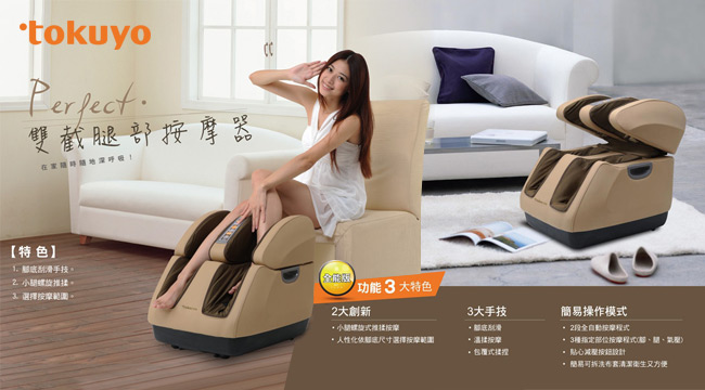品牌介紹 飛步機 美腿機 權益說明 品牌介紹 tokuyo以帶給每個人「元氣的每一天」為品牌信念,堅持高品質、平價奢華的人性化創新產品,秉持著最高品質的服務。以健康管理家的角色,提供按摩椅、跑步機、健身車、按摩紓壓產品等健康家電,讓每個人輕鬆完成元氣生活的夢想。 目前正積極打造一個「從台灣出發、邁向全世界」的健康事業品牌,並以精益求精、堅持品質的精神達到永續經營的目的,持續努力邁向健康家電業界的領先地位,並將觸角伸展至海外,在上海成立上海督洋國際有限公司,同時也成為日本三洋在大陸之總代理商。中國大陸市場目前除了在上海外,也積極在天津、大連、成都拓展更多營業據點,更是行銷歐、美、亞30餘國。 專業的研發技術團隊在新產品的創新及注入新功能上,按摩椅從「零重力」技術、「臀感」功能,到「製氧」技術等等,總是業界領先首發者。更是創造了全世界唯一會呼吸的「悠氧按摩椅」!tokuyo兼顧了醫學面與健康面,提供最實用性及人性化的商品! 品生活優惠憑證使用條款 此憑證由等值購物金兌換之 本憑證不得與其他優惠合併使用,且恕無法兌換現金 好康憑證不限本人使用,使用時店家將會核對憑證編號,一組編號限用一次 信託期間:發售日起一年內 本商品(服務)禮券所收取之金額,已存入發行人於台新銀行開立之信託專戶,專款專用。所稱專用,係指供發行人履行交付商品或提供服務義務使用查看好康憑證使用條款 飛步機 型號:TU-330 展開尺寸:高144 x 寬46 x 深(最大)156(cm) 折收尺寸:高154 x 寬46 x 深42(cm) 淨重:13.5kg 最大載重:110kg 品生活優惠憑證使用條款 此憑證由等值購物金兌換之 本憑證不得與其他優惠合併使用,且恕無法兌換現金 好康憑證不限本人使用,使用時店家將會核對憑證編號,一組編號限用一次 信託期間:發售日起一年內 本商品(服務)禮券所收取之金額,已存入發行人於台新銀行開立之信託專戶,專款專用。所稱專用,係指供發行人履行交付商品或提供服務義務使用查看好康憑證使用條款 美腿機 型號:TF-650 電源:110V~/60HZ 消耗功率:165W 淨重:23.4kg 外型尺寸:長515 × 寬530 × 高520(mm) 品生活優惠憑證使用條款 此憑證由等值購物金兌換之 本憑證不得與其他優惠合併使用,且恕無法兌換現金 好康憑證不限本人使用,使用時店家將會核對憑證編號,一組編號限用一次 信託期間:發售日起一年內 本商品(服務)禮券所收取之金額,已存入發行人於台新銀行開立之信託專戶,專款專用。所稱專用,係指供發行人履行交付商品或提供服務義務使用查看好康憑證使用條款 權益說明 配送事項 ●配送時間:商品最晚於購買成功3個工作日內出貨完畢,出貨後配送約3~5個工作日,恕無法 指定送達時間 ●配送方式:常溫宅配 鑑賞期 ●宅配商品可享七天鑑賞期,看更多詳細說明 品生活優惠憑證使用條款 此憑證由等值購物金兌換之 本憑證不得與其他優惠合併使用,且恕無法兌換現金 好康憑證不限本人使用,使用時店家將會核對憑證編號,一組編號限用一次 信託期間:發售日起一年內 本商品(服務)禮券所收取之金額,已存入發行人於台新銀行開立之信託專戶,專款專用。所稱專用,係指供發行人履行交付商品或提供服務義務使用查看好康憑證使用條款