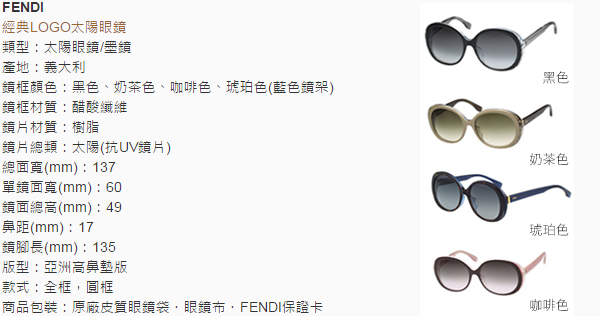FENDI FENDI(芬迪)為一家義大利流行品牌公司。最為人所熟之的為其baguette(原文為法國麵包之意)手提包以及其雙F之圖案。FENDI在西元1925年成立,本來是一間羅馬的皮草商店,現今成為LVMH旗下的跨國際奢侈品品牌。 國際時尚的領導風範,此款鏡架採雙F經典LOGO設計,散發出濃厚的品牌特色,亮麗耀眼視覺焦點,且針對鼻樑的地方加高設計,更符合東方人的臉型,完美流露出極致奢華生活品味。 品生活優惠憑證使用條款 此憑證由等值購物金兌換之 本憑證不得與其他優惠合併使用,且恕無法兌換現金 好康憑證不限本人使用,使用時店家將會核對憑證編號,一組編號限用一次 信託期間:發售日起一年內 本商品(服務)禮券所收取之金額,已存入發行人於台新銀行開立之信託專戶,專款專用。所稱專用,係指供發行人履行交付商品或提供服務義務使用查看好康憑證使用條款