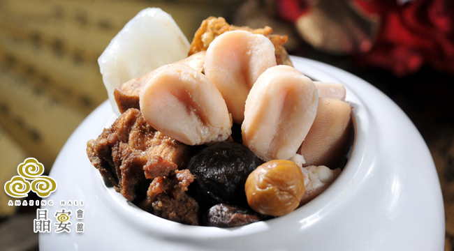 法式羊小排 主廚特調秘製的法式醬汁,鹹香回甘香氣濃郁,與新鮮宰殺的羊小排一起烹調至入味,一口咬下除了鮮甜肉汁外,還有無可取代的獨家醬汁好滋味,富有嚼勁的彈嫩肉質,讓您回味無窮。 鮑魚佛跳牆 含甕 紮實富有彈性的鮑魚,與豐富食材一同熬煮,香菇、栗子、筍干、芋頭、阿根廷魷魚、豬腳、雞肉、排骨、鳥蛋、魚肚等山珍海味一起到齊,費時控制火侯將精華熬煮至融入湯汁中,並保有本身鮮度與口感,鹹香甘甜又下飯,讓您一碗接一碗停不下來。 宮廷花雕蝦 主廚將中藥材與紹興酒以黃金比例調製,獨家的濃香甘醇酒味,經過一天浸泡滲透至蝦肉當中,彈牙可口的蝦肉帶有淡淡酒香,是一年四季都適合享用的聚餐料理。 香蔥油雞 秉持傳統的延續,肥嫩大隻以特製蔥油調味的雞腿肉,切成適當大小完全入味,拌隨著蔥油的鹹香,清淡不油膩,肉質軟嫩甘美不乾澀,美味迴盪舌間,年菜不可或缺精華風味。 干貝長年菜 芥菜稱長年菜,過年必備討喜團圓菜式,象徵長壽、苦盡甘來之意,為春節期間的吉祥菜。芥菜苦中帶點甘甜的滋味,與象徵「富貴」的干貝一同料理,料豐味足極為鮮美。 黃金酥 烤至金黃酥脆外皮,以蝦米、火腿、三星蔥等餡料,層層細緻的斷面切口,口口香酥,用心打造新層次料理,難以言喻的完美滋味,令人百吃不膩。 品生活優惠憑證使用條款 此憑證由等值購物金兌換之 本憑證不得與其他優惠合併使用,且恕無法兌換現金 好康憑證不限本人使用,使用時店家將會核對憑證編號,一組編號限用一次 信託期間:發售日起一年內 本商品(服務)禮券所收取之金額,已存入發行人於台新銀行開立之信託專戶,專款專用。所稱專用,係指供發行人履行交付商品或提供服務義務使用查看好康憑證使用條款
