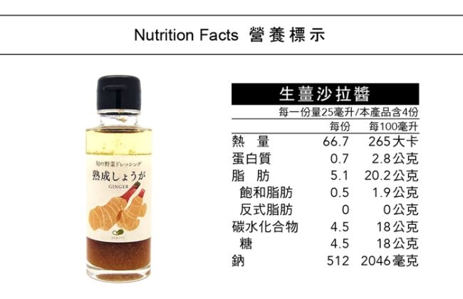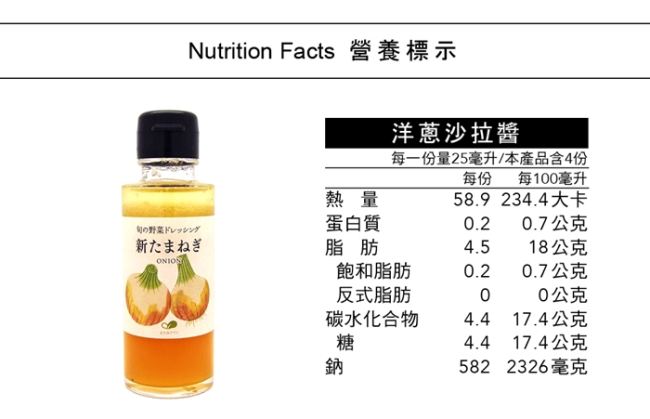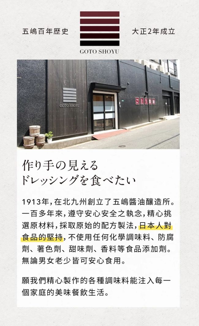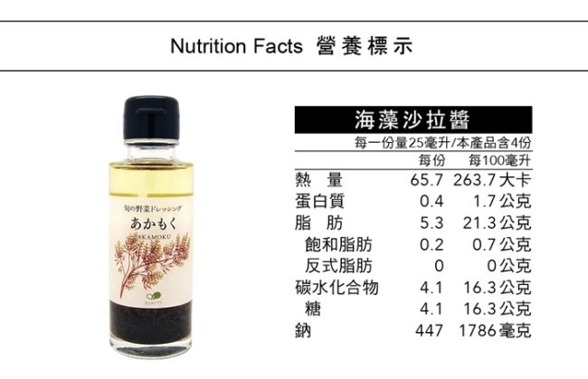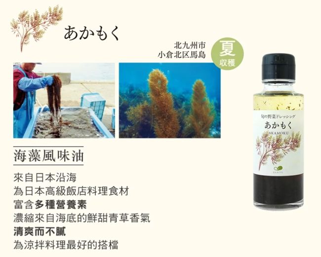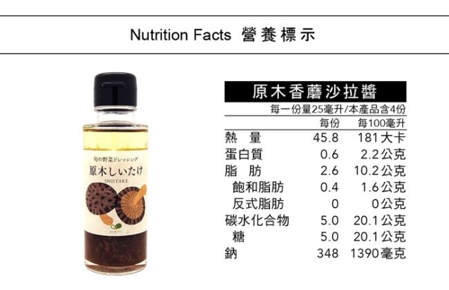 ★百年品牌,手工釀造無添加 ★日本媽媽的秘密,安心美味 ★無添加化學調味料、防腐劑 ★搭配簡單食材及可提升風味 ★100%原裝進口公司正貨 |番茄沙拉風味油| |洋蔥沙拉風味油| |海藻沙拉風味油| |生薑沙拉風味油| |原木香蘑沙拉風味油| 品生活優惠憑證使用條款 此憑證由等值購物金兌換之 本憑證不得與其他優惠合併使用,且恕無法兌換現金 好康憑證不限本人使用,使用時店家將會核對憑證編號,一組編號限用一次 信託期間:發售日起一年內 本商品(服務)禮券所收取之金額,已存入發行人於台新銀行開立之信託專戶,專款專用。所稱專用,係指供發行人履行交付商品或提供服務義務使用查看好康憑證使用條款